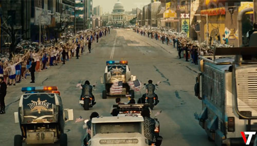 При переходе к крупному плану кортежа на Пенсильвания-авеню здания вдоль улицы исчезают, оставляя мотоцикл президента Камачо и автобус на фоне пустого неба. Они снова появляются при переходе к дальнему плану.