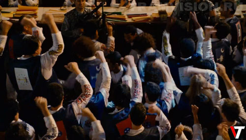 При переходе к крупному плану кортежа на Пенсильвания-авеню здания вдоль улицы исчезают, оставляя мотоцикл президента Камачо и автобус на фоне пустого неба. Они снова появляются при переходе к дальнему плану.